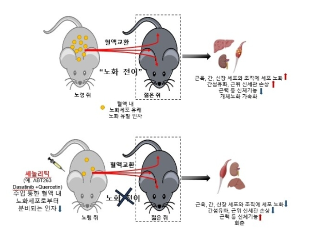 나이 많은 쥐의 혈액 속에서 순환하는 여러가지 인자들이 어린 쥐의 혈관에 들어가면 어린 쥐의 근력 감소 등 노화가 가속화했습니다. 반대로 나이 많은 쥐에 노화세포를 없애는 '세놀리틱 물질' 주입한다면 노화로 인해 증상을 막는 데 보탬이 되었습니다.