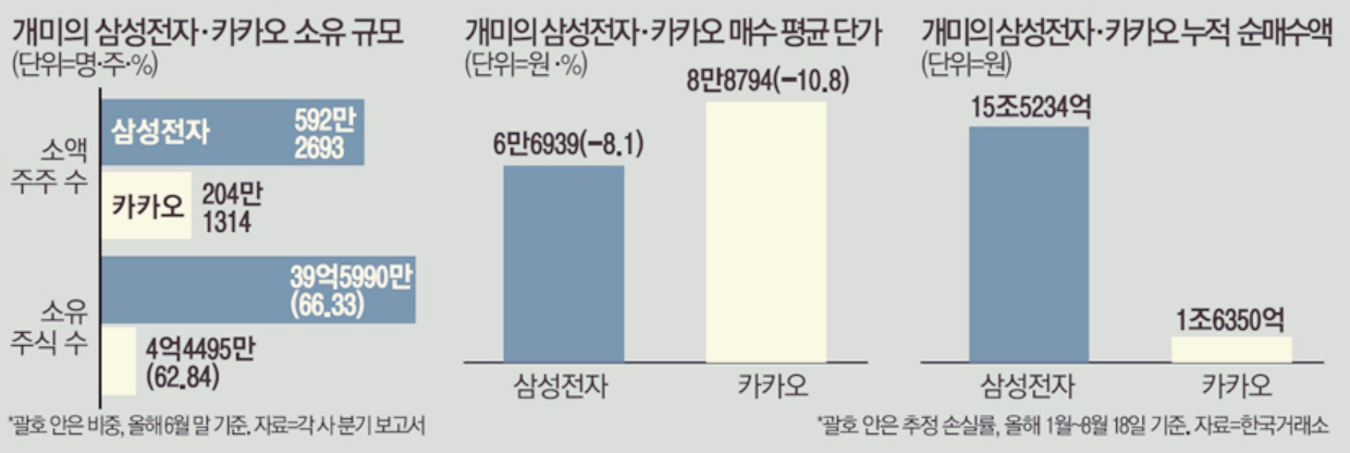 소액주주 수가 200만명을 웃도는 '국민주'인 삼성전자·카카오를 보유한 개미가 800만명에 달하는 것으로 나타났습니다. 금년 들어 증시 약세장이 계속돼 국민주 주가도 하락하면서 개미들의 손익분기점까지는 여전히 갈 길이 먼 상황입니다.