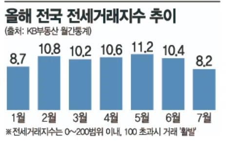 29일 부동산원에 따르면 7월 전국 전세거래지수는 8.2로 금년 들어 제일 낮은 수치를 나타냈습니다. 지난달 10.4에서 2.2포인트 감소해 1의 자리 수까지 떨어지면서 전세거래 시장의 암담한 모양을 보여줍니다. 전세거래지수는 표본 중개업소를 대상으로 설문조사를 통해 집계된 통계로 0에서 200 구간 이내이며 지수가 100을 초과할수록 전세거래가 활발하다는 것을 의미합니다.