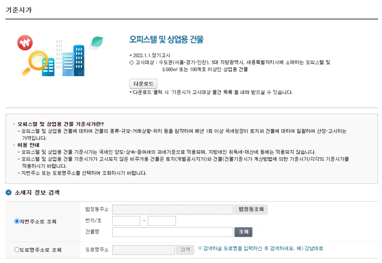조회 / 발급 - 기준시가 조회- 오피스텔 및 상업용 건물 순으로 클릭하고 주소를 입력하면 고시 연도별 오피스텔의 기준시가를 검색할 수 있습니다.