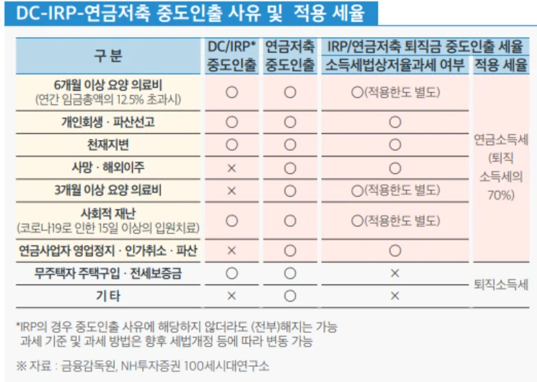 개별형 퇴직연금의 경우 55세가 지난 후부터 매달 연금 방식으로 수령케 되면 최고 30퍼센트의 퇴직 소득세를 줄일 수도 있습니다. 그렇지만 중도에 해지를 하게 되면 감면을 받았던 부분들에 대해서 기타 소득세가 발생할 수가 있어 주의가 필요합니다.